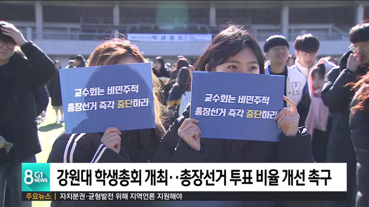 강원대 춘천캠퍼스에서 열린 학생총회에서 총학생회는 민주적인 총장 선거를 위한 재학생의 결의와 함께 총장 선거의 투표 반영 비율 선정에 대해 대학이 협의체를 구성할 것을 촉구했습니다.