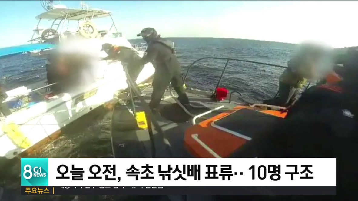 오늘 오전 11시48분쯤 속초 외옹치 동방 약 2.4㎞ 해상에서 추진기에 그물이 걸려 표류하던 낚싯배 승선원 10명이 구조됐습니다.