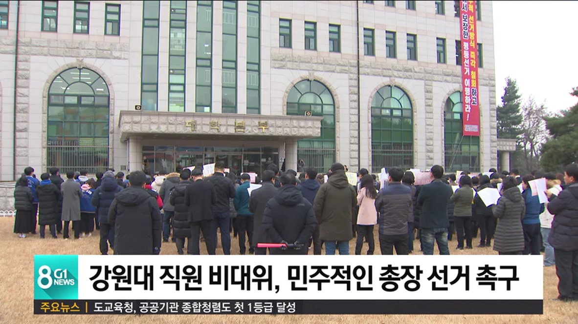 강원대학교 직원으로 구성된 비상대책위원회는 오늘(9일), 대학본부에서 총장임용 후보자 선거방식에 반대하는 결의대회를 열었습니다.