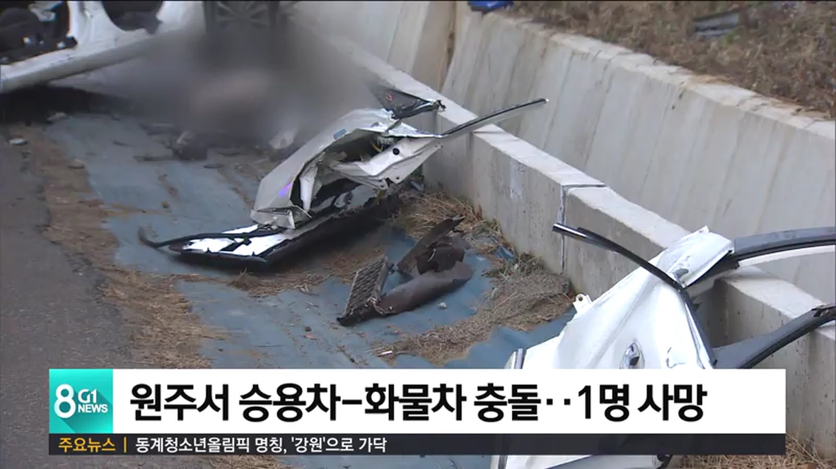 오늘 오후 4시쯤 원주시 소초면 수암리 42번 국도에서 K7 승용차가 25톤 화물차와 정면으로 부딪혔습니다.