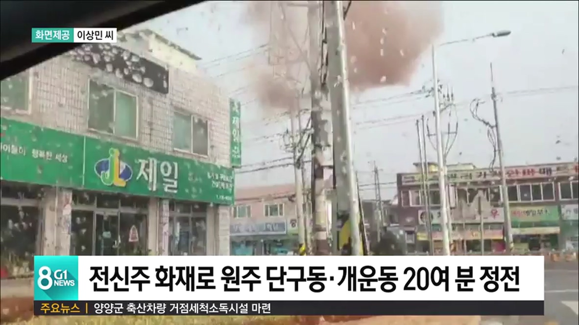 전신주 화재로 원주 단구동.개운동 20여분 정