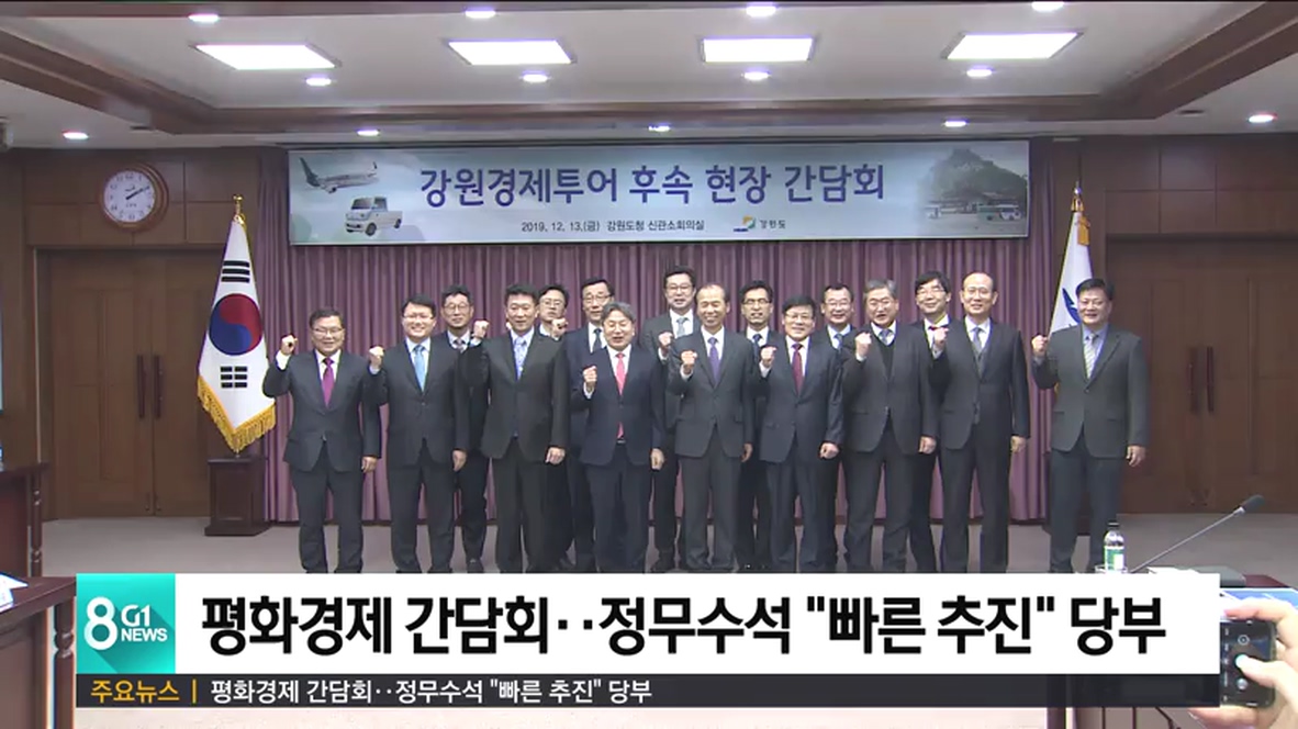 청와대 정무수석과 국가균형발전위원회, 정부 부처 고위 관계자들이 참석하는 강원 평화경제 간담회가 오늘 강원도청 신관 회의실에서 열렸습니다.