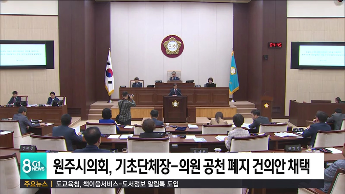 원주시의회가 오늘 열린 제214회 정례회에서 '기초지방자치단체장과 의원 선거에 대한 정당의 후보자 추천 폐지 건의안'을 채택했습니다.