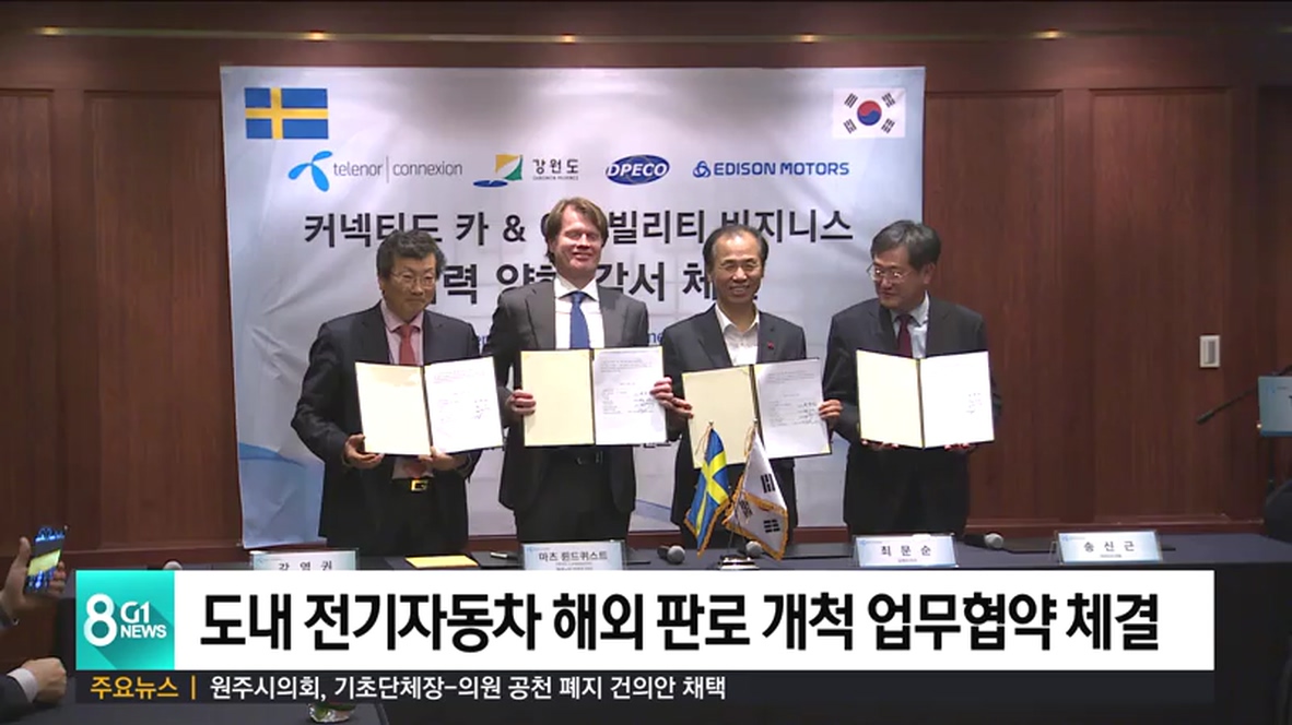 강원도와 주식회사 디피코, 세계 최대 모바일 네트워크 사업자 가운데 하나인 텔레노어 커넥션은 전기차 해외 진출을 위한 업무 협약을 체결했습니다.