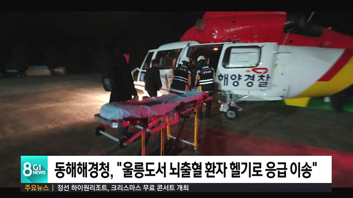 동해지방해양경찰청은 오늘(22일) 새벽 1시 50분쯤, 울릉의료원에서 심각한 뇌출혈 환자의 응급 이송 요청에 따라, 헬기로 강릉의 한 대형병원으로 환자를 이송했다고 밝혔습니다.