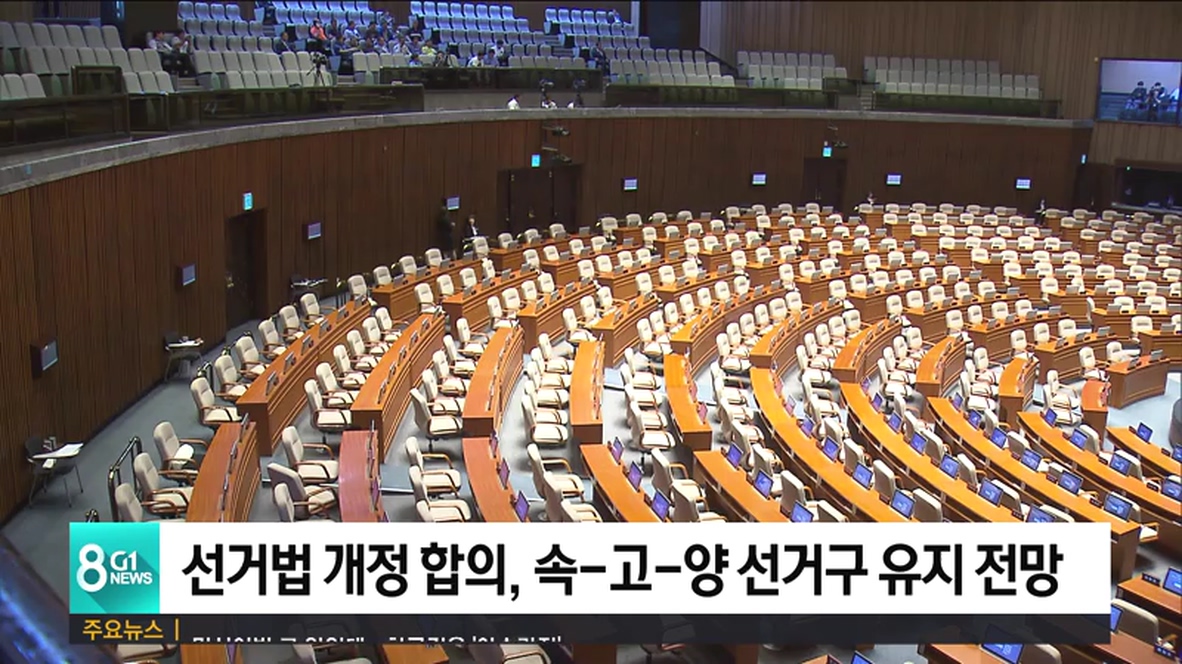 이번 합의대로 선거법 개정이 이뤄지면, 도내 에서 통폐합 대상으로 거론됐던 속초-고성-양양 선거구는 올해 1월 기준 하한 인구수인 13만 8천 204명보다 370여명이 넘어 선거구가 유지될 전망입니다.