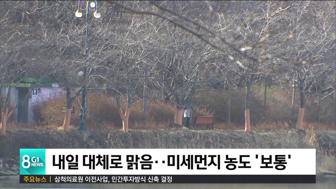일요일인 내일은 대체로 맑겠고, 영서와 영동지역 미세먼지 농도는 모두 '보통' 수준으로 예보됐습니다.