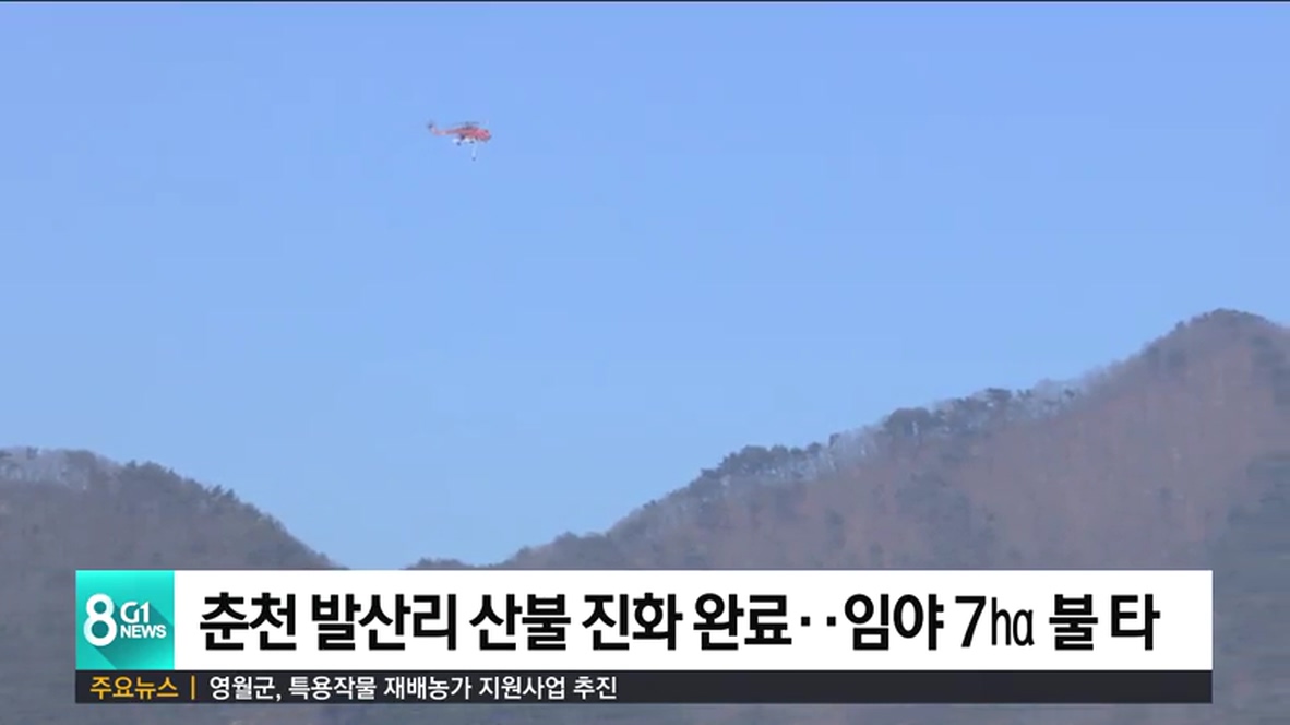 강원도 산불방지대책본부와 산림·소방 당국 은 춘천과 인근 시군 소방헬기 9대 등의 장비와 인력을 투입해 오늘(5) 오전 11시 30분쯤 진화를 완료했습니다.