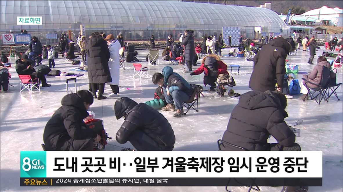 도내 곳곳에 시간당 30~80mm의 비가 내리고 있는 가운데, 일부 겨울축제장이 방문객 안전을 위해 행사운영을 일시적으로 중단하고 있습니다.