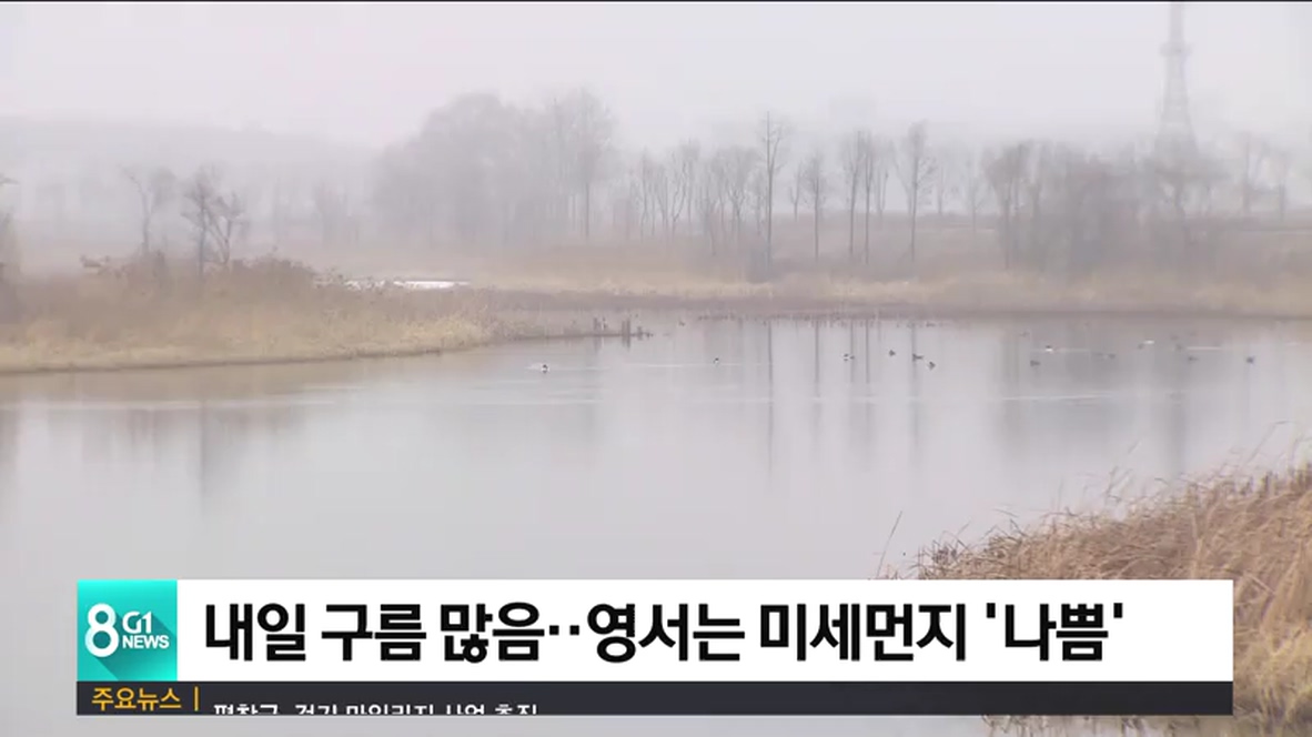 내일 강원도는 대체로 구름 많은 가운데, 영서지역은 미세먼지 농도가 '나쁨' 수준을 보이겠습니다.