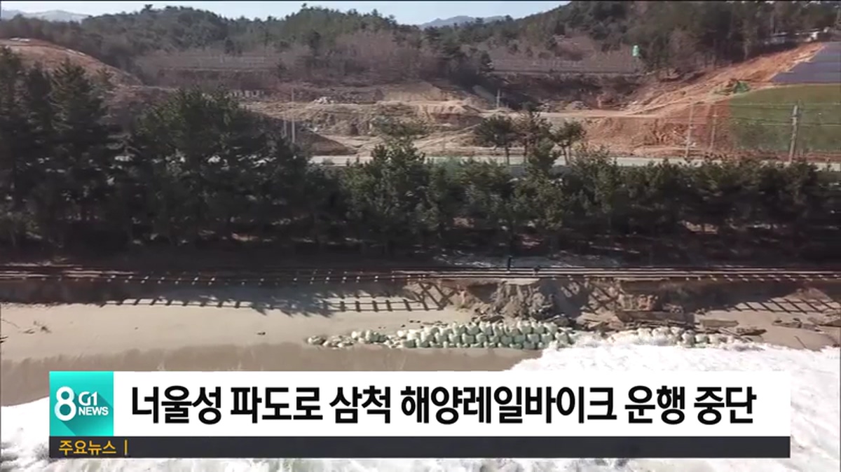 삼척시는 지난 주말 너울성 파도로 인해 해양 레일바이크 철로 아래 지반 50m 가량이 심하게 깎여 운행을 중단시켰다고 밝혔습니다.