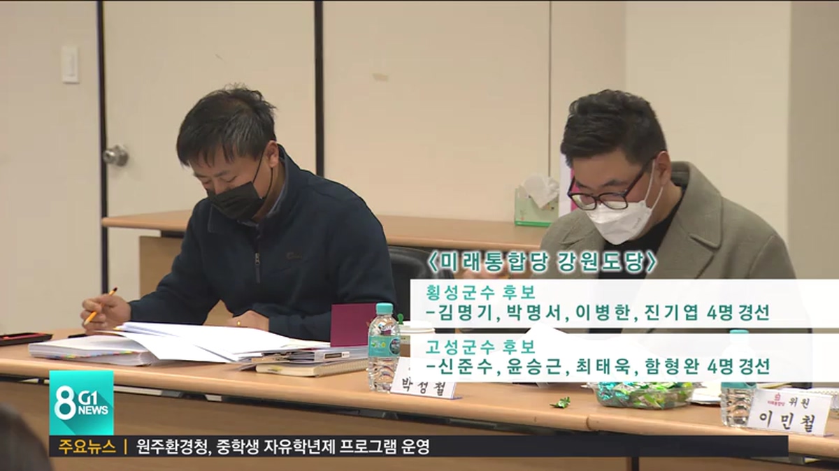 횡성군수 선거는 김명기, 박명서, 이병한, 진기엽 등 4명을, 고성군수 선거는 신준수, 윤승근, 최태욱, 함형완 등 4명의 후보를 각각 당원 50%와 일반 50%를 반영한 여론조사 경선을 통해 후보를 확정하기로 했습니다.