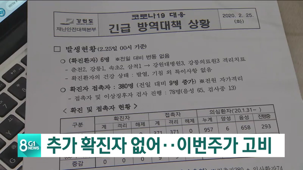 이틀째 강원도에서 추가 확진자가 나오지 않았습니다. 강원도는 이번주가 코로나 사태의 분수령이 될 것으로 보고 총력 대응하고 있습니다.