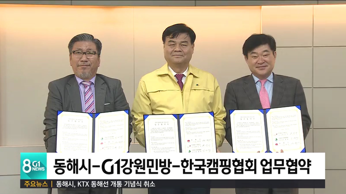 동해시와 G1강원민방, 한국캠핑협회가 오늘(27일) 동해시 통상상담실에서 대한민국 캠핑페스타 성공 개최를 위한 업무 협약을 체결했습니다.