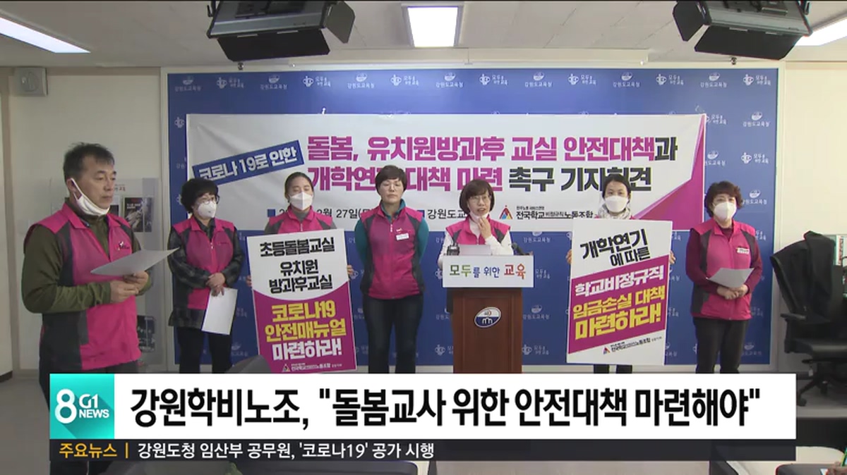 강원학교비정규직 노동조합은 도교육청에서 기자회견을 열고, 학교 내 돌봄 전담사에 대한 안전지침을 시급히 마련해야한다고 주장했습니다.