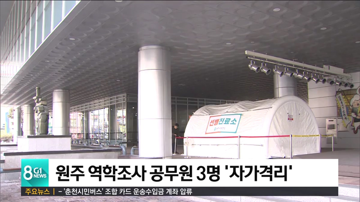 원주시는 11번과 12번 확진자를 역학조사하던 보건소 직원 3명이 밀접 접촉자로 분류돼, 검체 검사를 받고 자가격리됐다고 밝혔습니다.