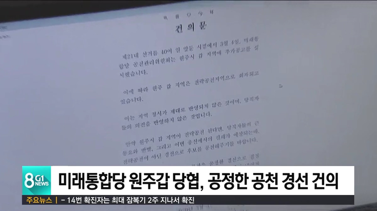 미래통합당 원주갑 당원협의회 당직자 일동은 오늘 건의문을 내고, 당 공천관리위원회는 전략공천이 아닌 경선으로 후보를 공천할 것을 촉구했습니다.