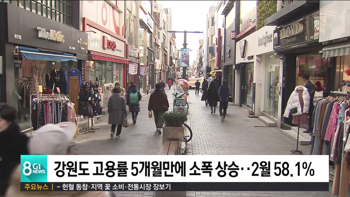 강원지방통계지청의 자료를 보면, 올해 2월 고용률은 58.1%로 한 달 전보다 1.8%포인트 올랐습니다.