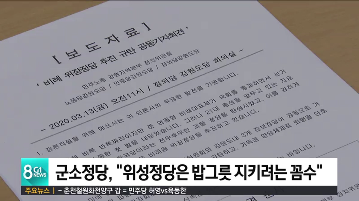 민주노총 강원지역본부 정치위원회와 정의당 등 도내 4개 군소정당이 기자회견을 열어 비례위성정당을 강력 규탄하고 나섰습니다.