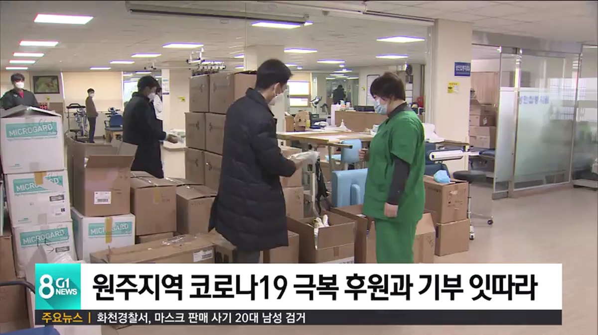 더사랑소아청소년과의원은 코로나19 방역물품 후원금 500만원을 원주시에 기탁했고, 한국보훈복지의료공단도 마스크 천장을 전달했습니다.