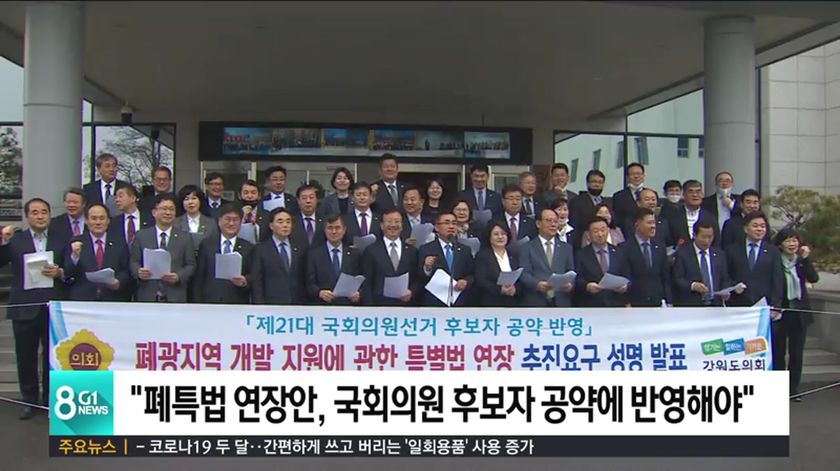 강원도의회가 폐광지역 개발 지원에 관한 특별법의 기한 연장을 이번 국회의원 선거 후보자 공약에 반영해야한다고 주장했습니다.