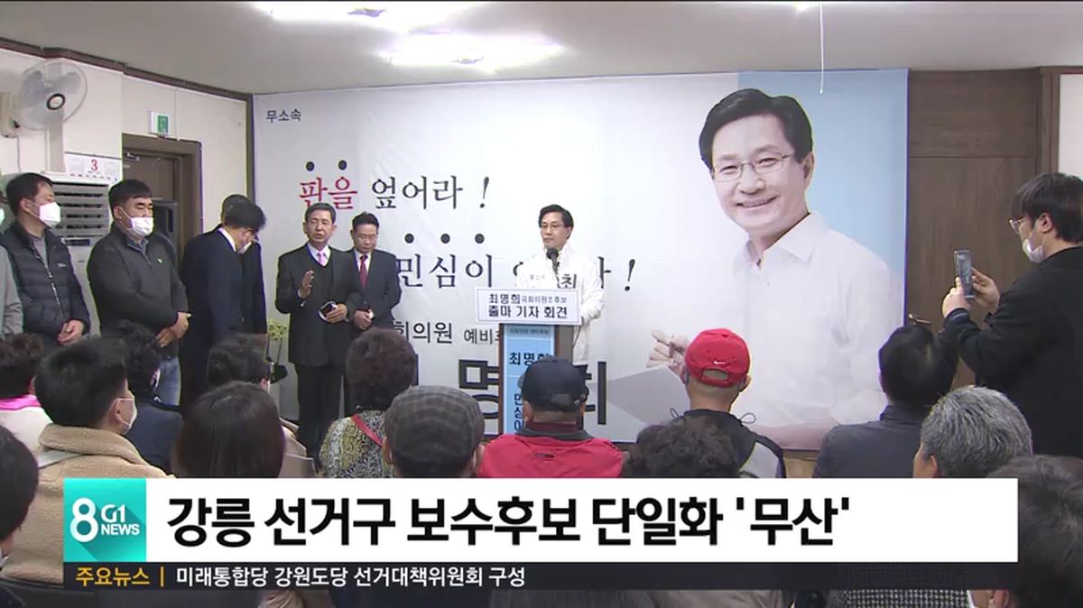 미래통합당 강릉시 선거구 예비 후보자들이 공천 배제에 반발해 무소속으로 잇따라 출마한 가운데, 보수후보간 단일화가 사실상 무산됐습니다.
