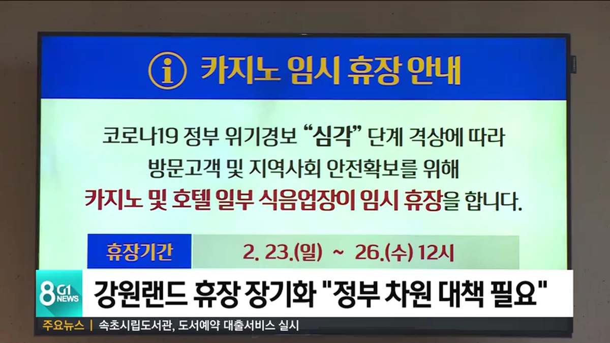 강원랜드는 지난달 23일부터 영업을 중단하고 있으며 지금까지 매출손실액은 1,167억 원으로 추정됩니다.