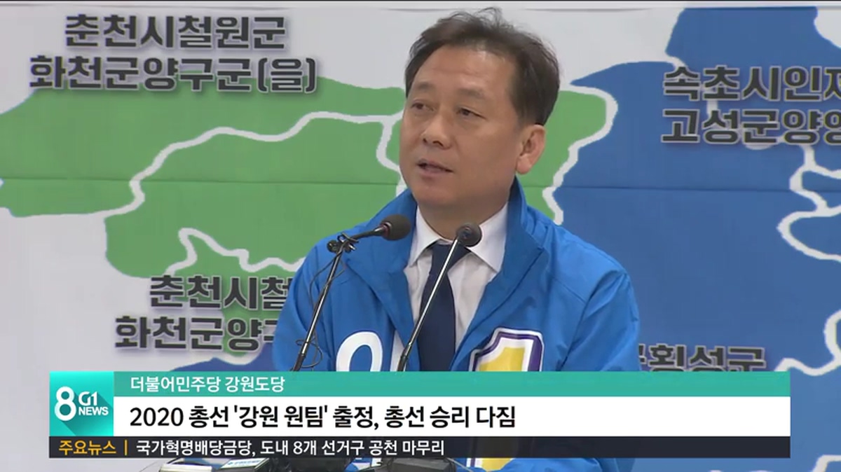 더불어민주당 강원도당은 이광재 공동 선대위원장을 비롯한 도내 8개 선거구 후보들이 참석한 가운데 '2020 총선 강원 원팀 출정식'을 열고, 지역별 비전 발표와 총선 승리 다짐 퍼포먼스를 진행했습니다.