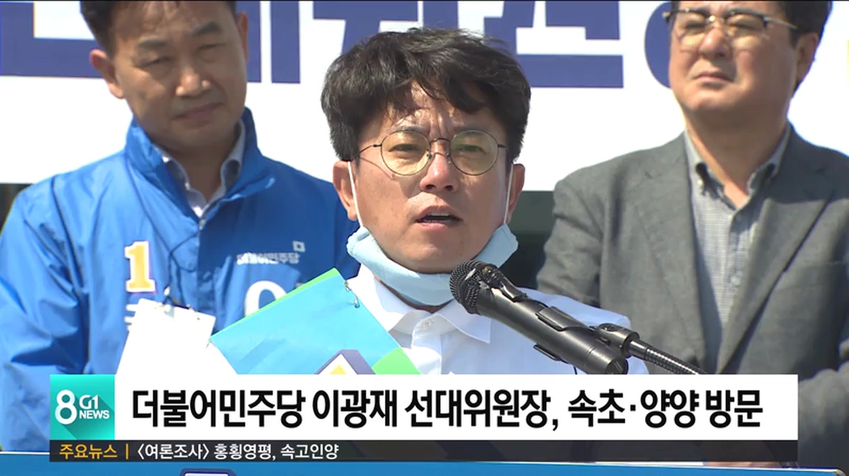 더불어민주당 이광재 공동상임선대위원장이 속초와 양양을 찾아 여당 후보에 대한 지지를 호소하고, 설악산 오색케이블카 유치를 약속했습니다.