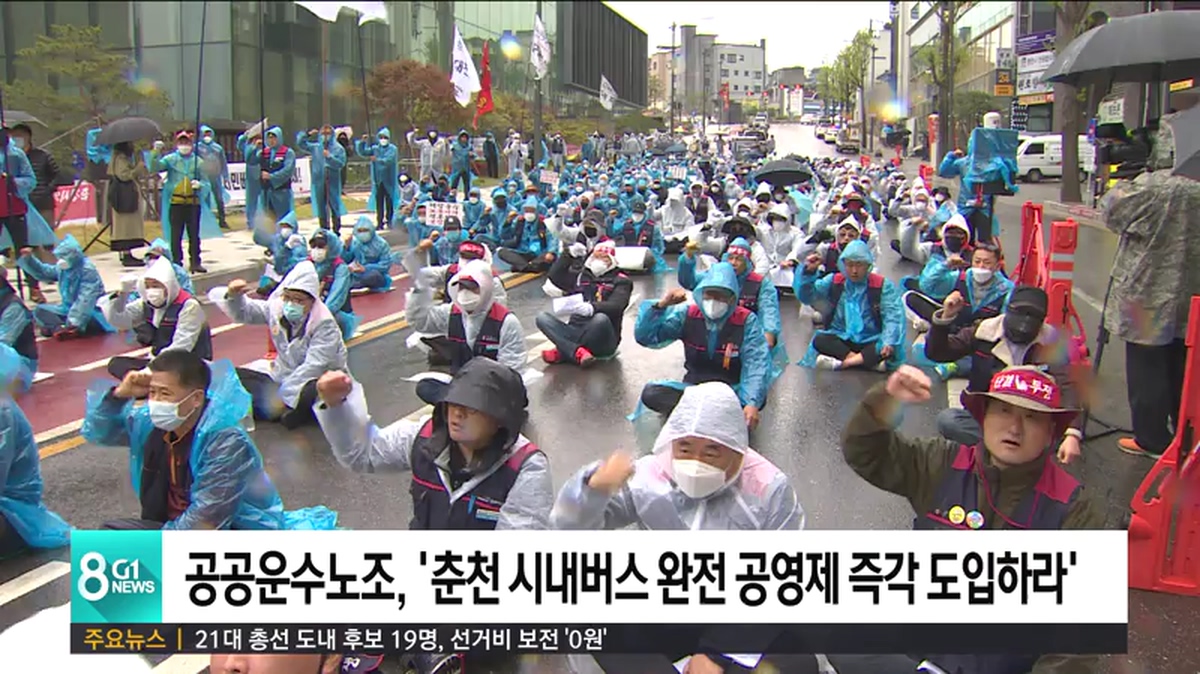 전국공공운수노조 강원지역본부는 오늘 춘천시청 앞에서 춘천 시내버스 완전 공영제 즉각 도입을 촉구하는 대규모 결의대회를 열었습니다.