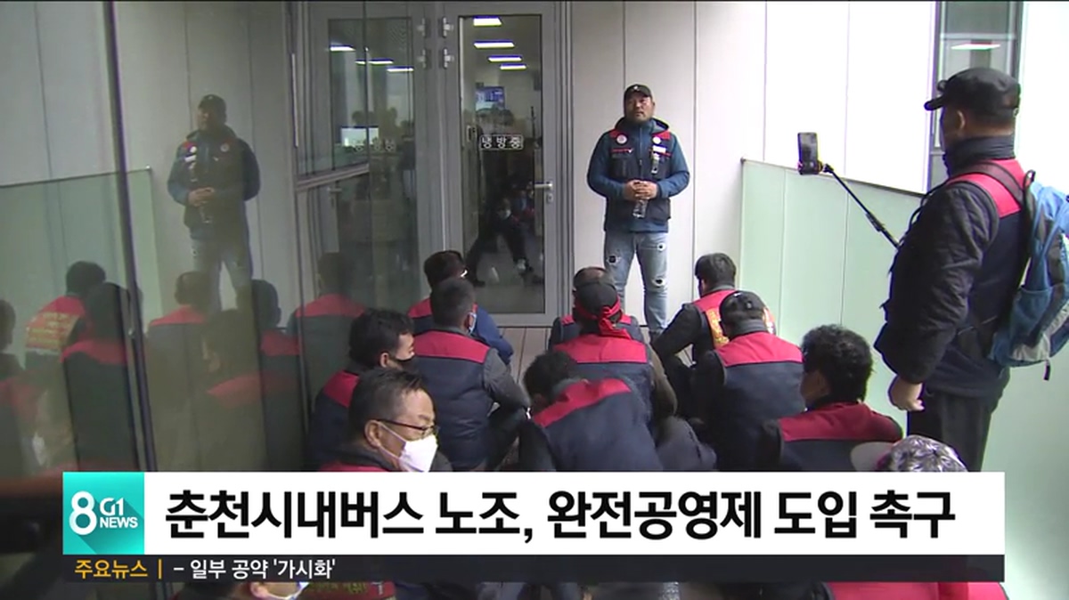 춘천 시내버스 완전 공영제 도입을 주장하고 있는 시내버스 노조가 오늘 시청사를 점거한채, 버스 운행을 거부하며 투쟁 수위를 높이고 있습니다.