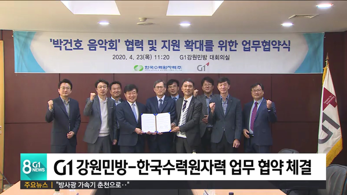 G1강원민방과 한국수력원자력 주식회사는 오늘(23일) G1본사 대회의실에서 허인구 G1사장과 정재훈 한수원 사장, 정헌철 한강수력본부장 등이 참석한 가운데 '박건호 음악회' 성공 개최를 위한 업무 협약을 맺었습니다.