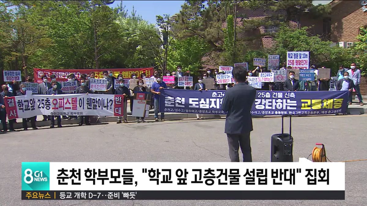 춘천시내 학교밀집지역에 25층 오피스텔 건립이 추진되고 있는 것과 관련해, 인근학교 학부모와 동문 등으로 구성된 '범시민 대책위원회'가 강하게 반발하고 있습니다.