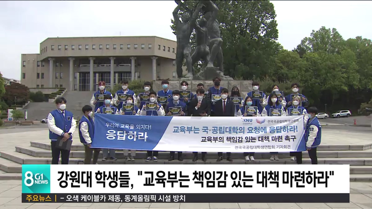 강원대학교 총학생회 등 학생 30여 명은 기자회견을 열고, 코로나19 사태에 따른 비대면 강의로 교육의 질이 저하됐다면서 등록금 반환 등 교육부 차원의 대책마련을 촉구했습니다.