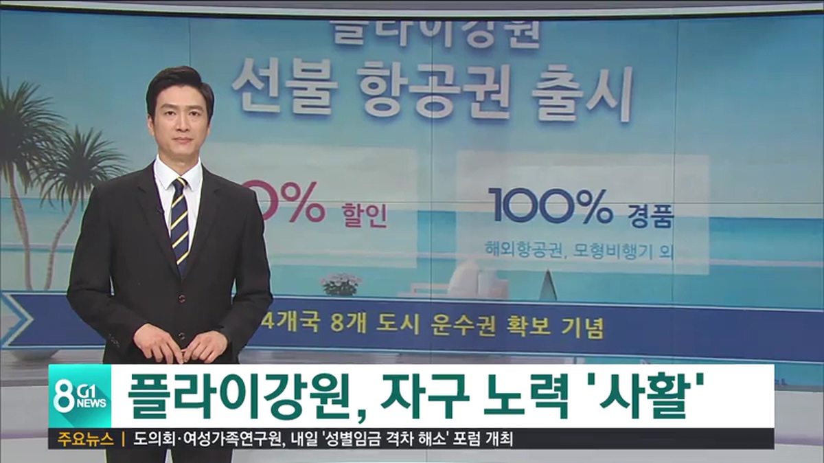 "강원도는 국제선 취항 전담팀을 가동해, 자구책 마련에 뛰어든 플라이강원을 지원사격할 계획입니다. G1뉴스 원석진입니다."