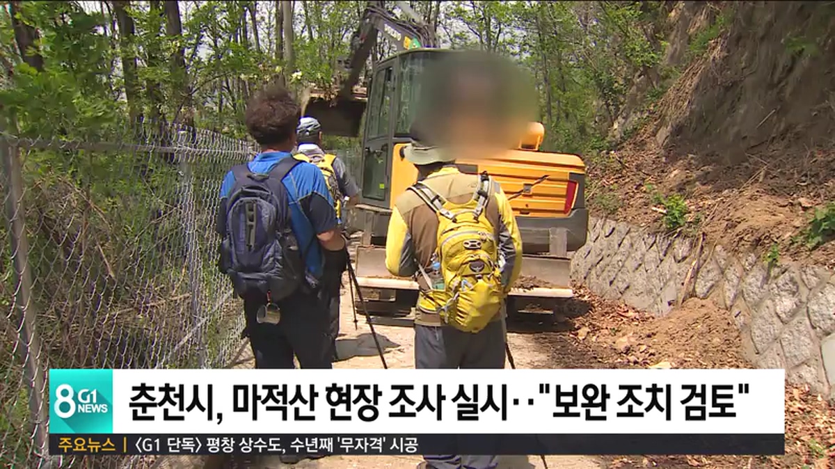 춘천시 산림과와 안전총괄담당과는, 지난주 G1이 산사태 가능성을 제기한 신북읍 천전리 마적산을 방문해 흙 쓸려내림 현상 등을 확인하고, 훼손된 급경사면 일부를 수습했다고 밝혔습니다.