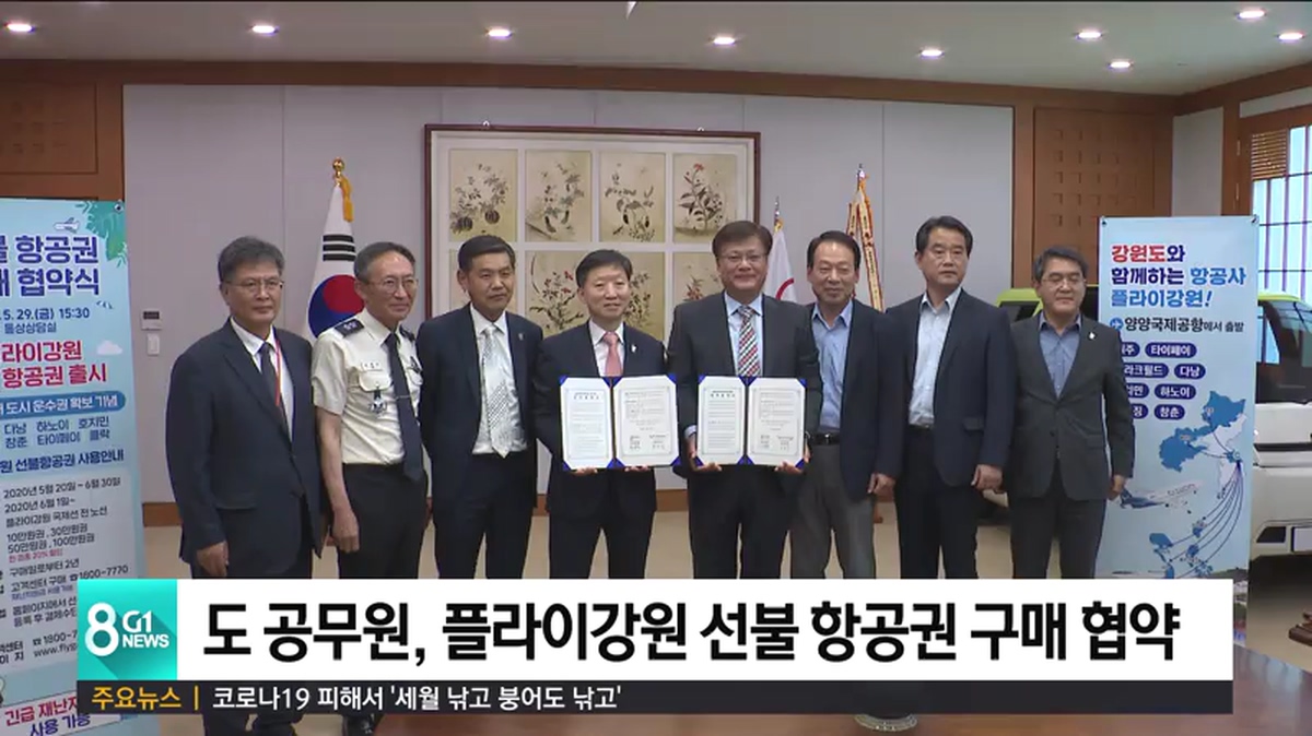 우병렬 강원도 경제부지사를 비롯한 강원도 공무원은 플라이강원과 '선불항공권' 구매 협약을 맺고, 긴급재난지원금을 활용한 항공권 구매에 적극나서기로 했습니다.