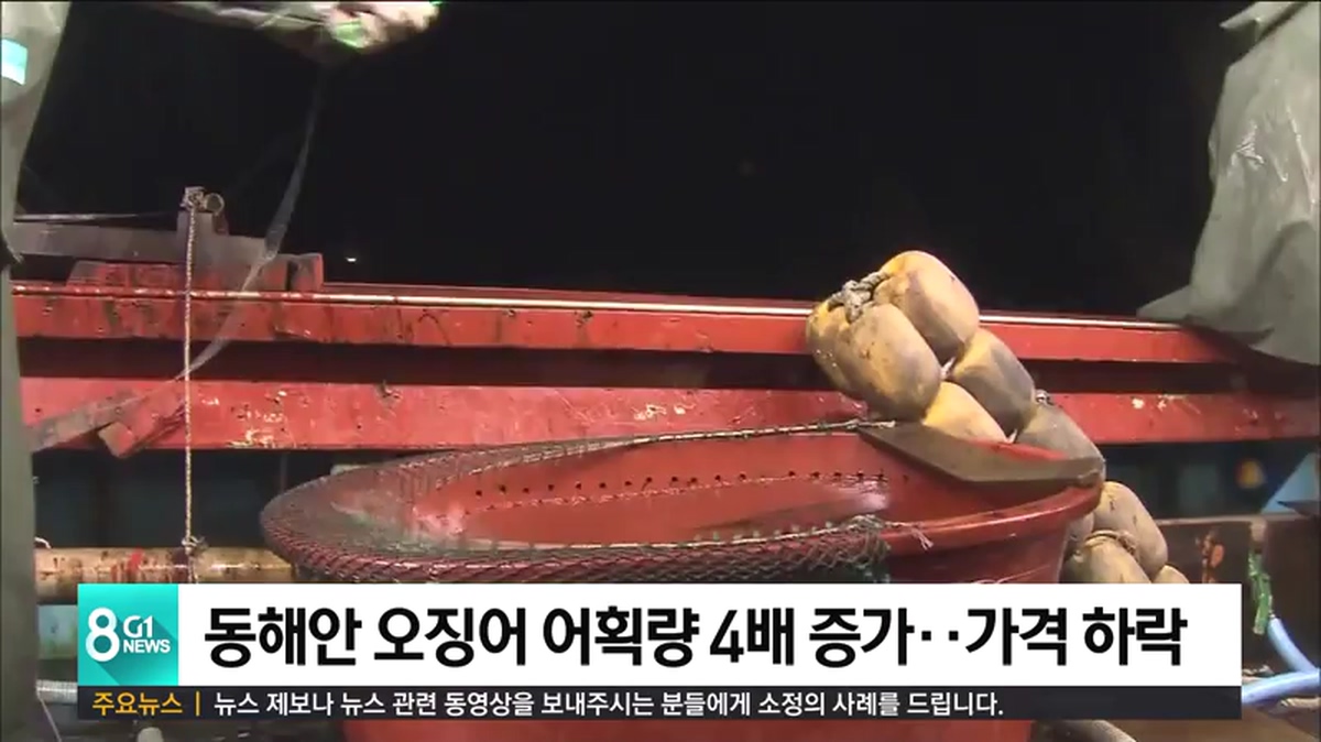 강원도환동해본부에 따르면, 지난달 19일부터 지난 11일까지 동해안에서 잡힌 오징어는 940톤으로, 지난해 같은 기간보다 4배 이상 증가했습니다.