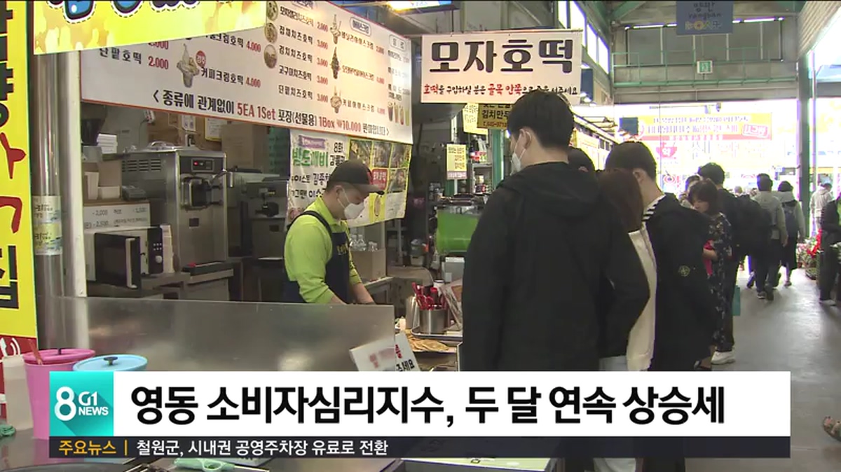 영동 지역은 관광객 숫자가 늘고 있고, 긴급 재난금이 시장이 풀리면서 소비 심리가 개선되면서 소비자 심리 지수가 올랐다고 분석했습니다.