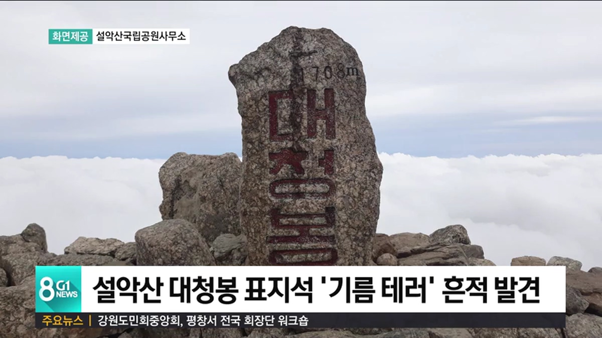 설악산국립공원은 지난 23일 야간 순찰 직원이 대청봉 표지석에서 기름으로 추정되는 액체가 흘러내린 흔적을 발견했다고 밝혔습니다.