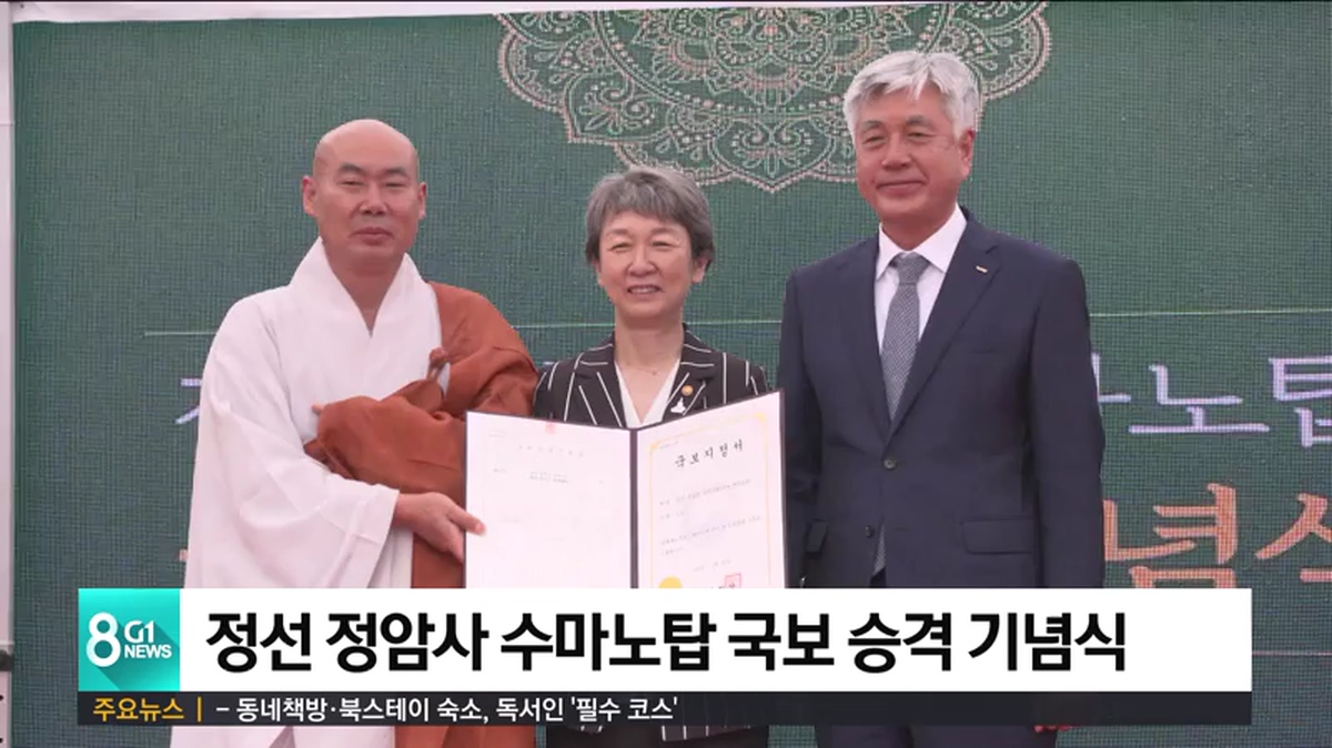 국보 제332호로 승격된 정선 정암사 수마노탑의 국보 승격을 축하하는 기념식이 오늘(10일) 정암사 경내에서 열렸습니다.