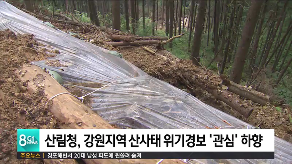 산림청 산사태예방지원본부는 강원도 지역에 내린 산사태 위기경보를, 오전 10시 30분을 기해 '주의'에서 '관심'으로 하향조정했습니다.