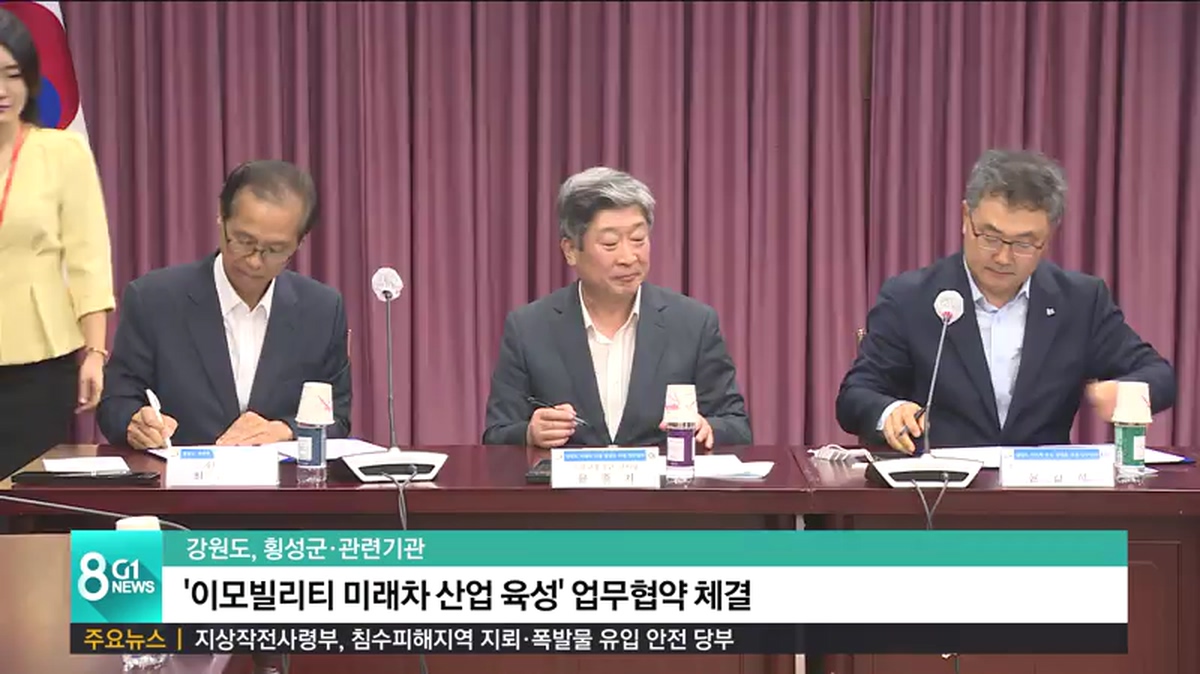 강원도는 도청 신관 소회의실에서 한국건설생활환경시험연구원, 도로교통공단, 강원테크노파크, 횡성군과 '강원도 미래차 산업 발전을 위한 업무 협약'을 체결했습니다.