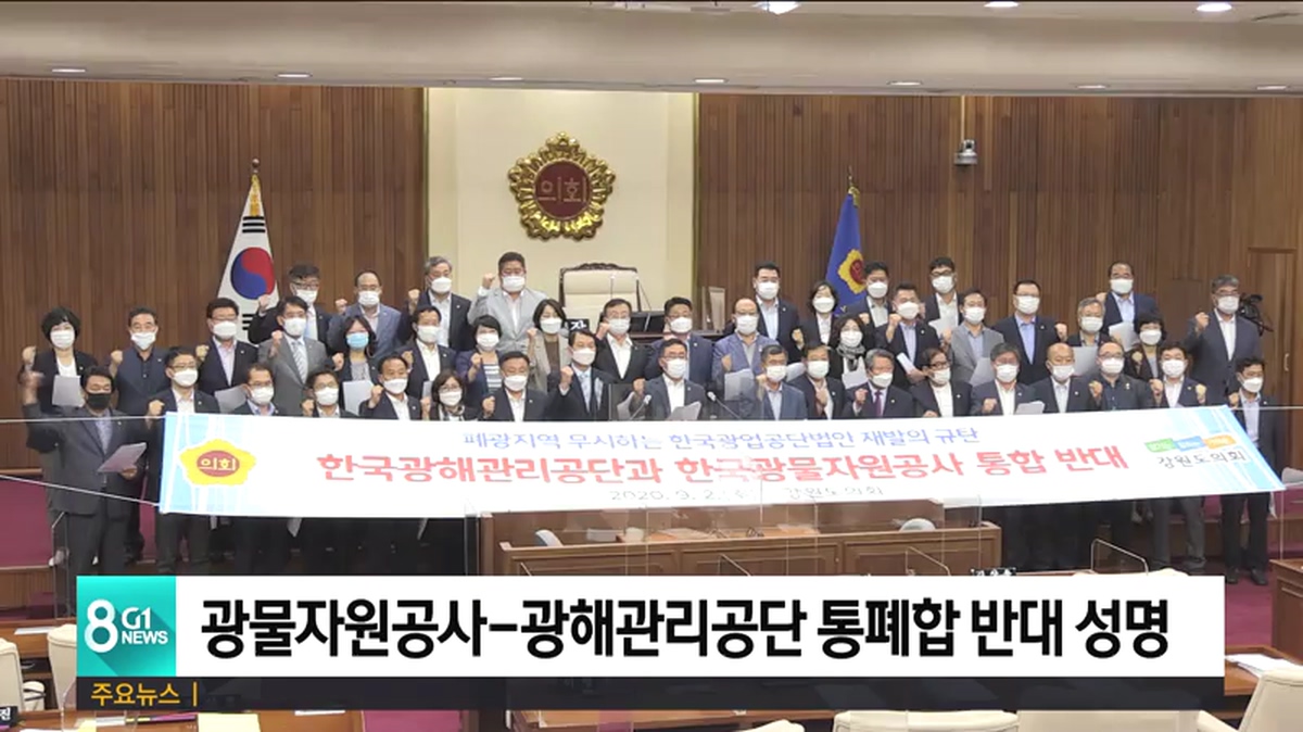 강원도의회 의원 전원은 성명을 통해 "해외자원개발사업 실패로 자본잠식에 빠진 광물자원공사와 광해관리공단의 통합 추진에 반대한다"고 밝혔습니다.
