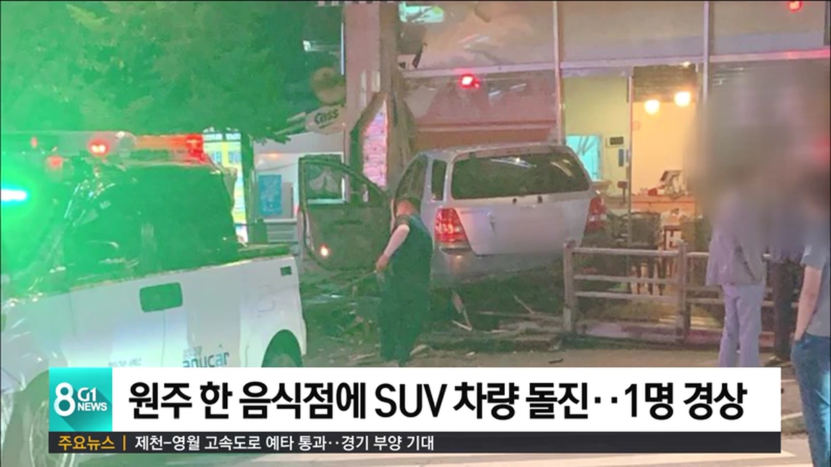 오늘(4) 자정쯤 원주 단계동의 한 음식점에 SUV 차량이 돌진해, 가게 주인 1명이 다치는 등 사고가 발생했습니다.