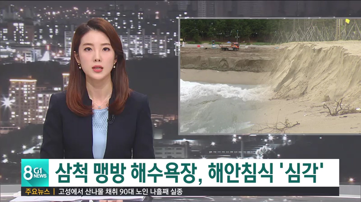 한 연구팀이 맹방해변 모래사장 거리를 측정해봤더니 지난해보다 폭은 7m 줄어들었고, 연안침식 속도는 이전보다 40% 빨라진 걸로 보고 있습니다.