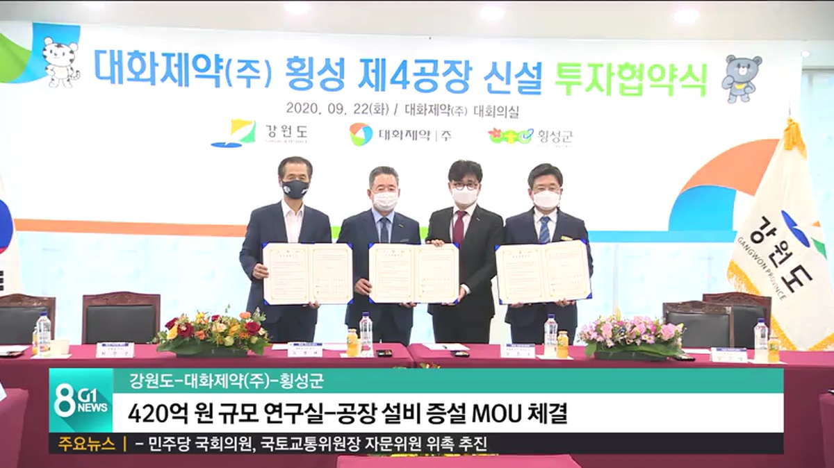 강원도와 횡성군, 대화제약 주식회사는 업무 협약을 맺고, 오는 2023년 1월까지 횡성에 420억 원 규모의 연구실과 공장, 설비 증설을 추진하는 투자협약을 체결했습니다.
