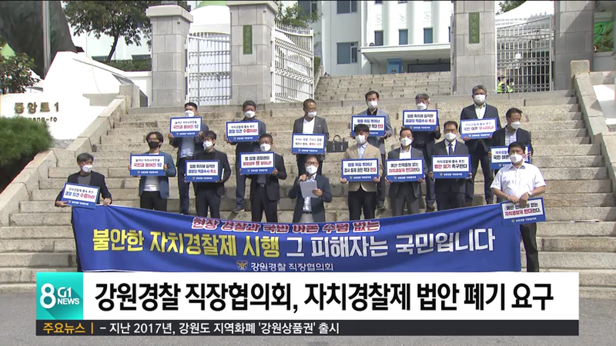 지난 달 국회에 발의된 자치경찰제 도입 법안을 놓고 일선 경찰의 반발이 거세지고 있는 가운데, 강원경찰 직장협의회도 오늘(24일) 도청 앞 광장에서 기자회견을 열고 자치경찰 법안의 폐기를 요구했습니다.