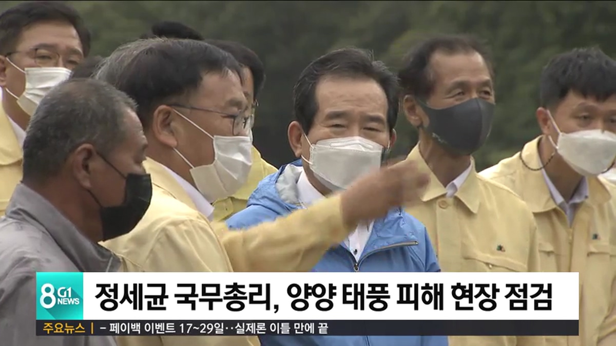 정세균 국무총리가 오늘 태풍 마이삭과 하이선으로 피해를 입은 양양 지역을 찾아 복구 상황을 점검했습니다.