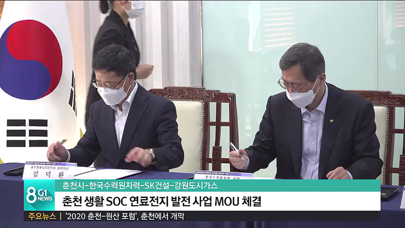 춘천시와 한국수력원자력, SK건설, 강원도시가스 등은 오늘 춘천시청에서 '춘천시 생활 SOC 연료 전지 발전사업 추진을 위한 공동사업개발 업무 협약을 체결했습니다.